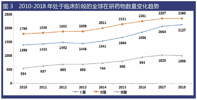 對處于臨床研究階段的在研藥物數(shù)據(jù)進一步分析后發(fā)現(xiàn),2018年處于Ⅰ期、Ⅱ期和Ⅲ期臨床研究階段的藥物數(shù)量分別為2127、2360和1006個,增幅分別為3.1%、0.1%和-1.9%。處于臨床Ⅱ期的藥物數(shù)量基本無變化,但處于臨床Ⅲ期的藥物數(shù)量則出現(xiàn)了小幅下滑,因此不難看出,處于研發(fā)后期的品種仍存在流失率較高的情況,應(yīng)引起注意。