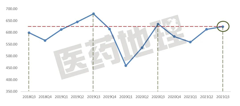 基于PDB國內樣本醫院市場數據,2021年前三季度共實現銷售額約1797億元,相較于2020年同期回升10.24%。雖然2020Q1是近三年來的最低點,但2021Q3卻成為近兩年的三季度最低點,Q2到Q3的環比提升僅1.86%。如果按照往年的Q4季節性回落推算,2021年全年市場銷售額仍與2019年有著不小的差距。
