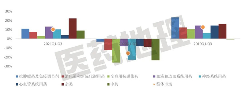 圖2樣本醫院市場TOP8治療類別近年增長趨勢(2019Q1-Q3,2020Q1-Q3,2021Q1-Q3)
