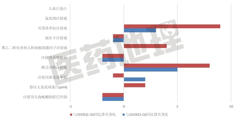 圖3樣本醫院市場TOP10產品排名變化(2021Q1-Q3)