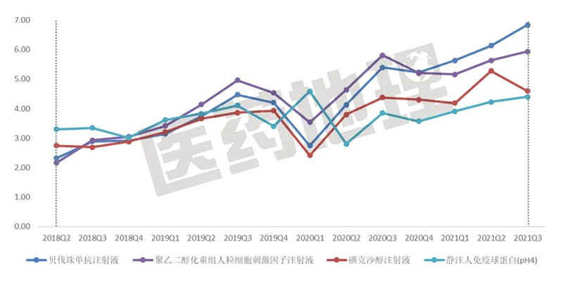 具體來看,近三年間排名只升不降的有4個產品,競爭非常激烈。在2018年二季度時,4個產品的排名依次是靜注人免疫球蛋白、碘克沙醇、貝伐珠單抗和粒細胞刺激因子,季度銷售額最大差距為1.14億元;但到了2021年三季度,排名已經變成了貝伐珠單抗、粒細胞刺激因子、碘克沙醇和靜注人免疫球蛋白,季度銷售額最大差距擴大至2.44億元。未來或有新產品入局。