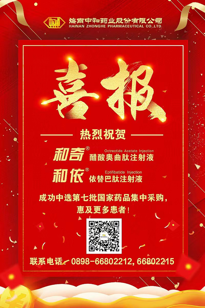 2022年7月12日,在國家醫保局等相關部門組織和指導下,全國各省份組成采購聯盟開展第七批國家組織藥品集中采購在江蘇省南京市開標。海南中和藥業股份有限公司攜兩產品參加了本次國采并成功雙雙中選,和依®依替巴肽注射液6進4第一順位中標,和奇®奧曲肽注射液10進8,第七位順利中標。