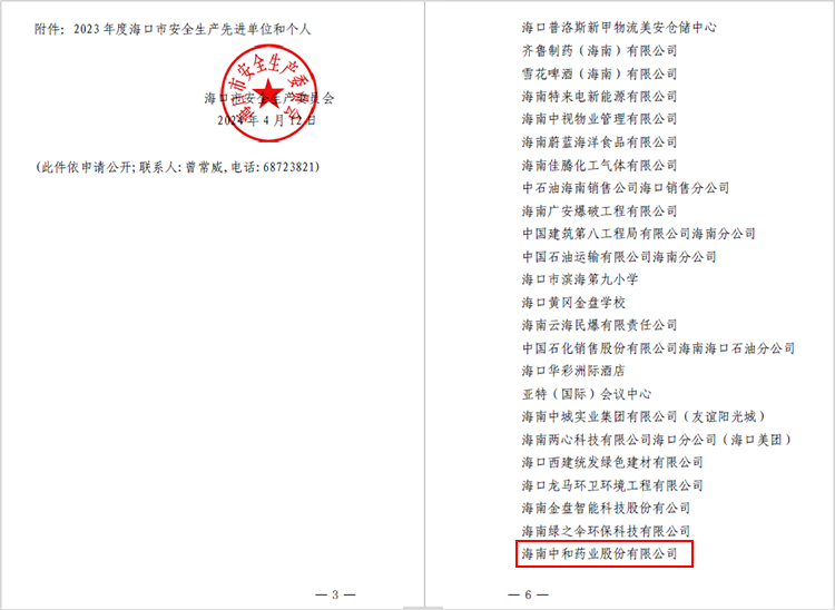 近日,海口市安全生產(chǎn)委員會印發(fā)《海口市安全生產(chǎn)委員會關(guān)于2023年度安全生產(chǎn)先進單位和個人的通報》(海安委〔2024〕3號),海南中和藥業(yè)股份有限公司獲評安全生產(chǎn)先進單位稱號。