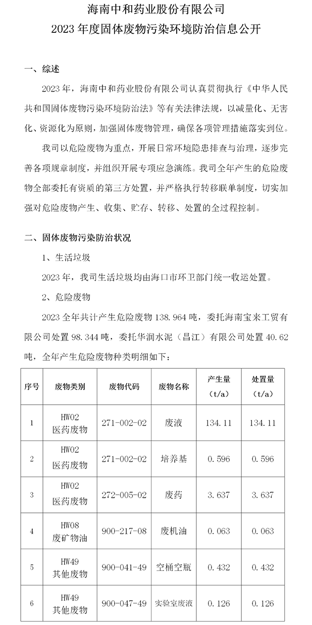 海南中和藥業股份有限公司固體廢物污染環境防治信息公開(2023年度)
