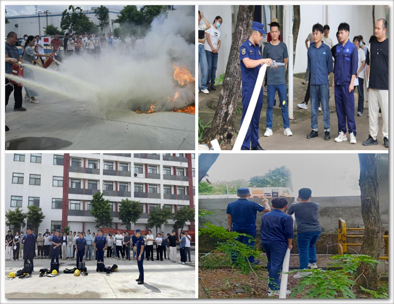 6月安全月系列活動的最后一項是消防器材實操演練。在演練中,首先在專業消防人員的指導下,點燃演習專用鐵桶內汽油,參與演練員工依次排隊實際操作滅火器進行滅火;然后公司應急消防隊伍4個人演練消防服穿著示范。最后,進行室外消火栓、消防水帶、水槍消防器材使用演練。通過以上消防器材實操演練或示范觀看,員工熟悉了常用消防器材性能和操作流程,確保在火災發生時能夠迅速、正確地使用這些器材進行滅火,控制火勢蔓延,夯實公司一線員工撲滅初期火災的能力。
